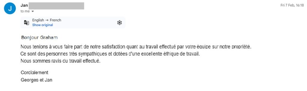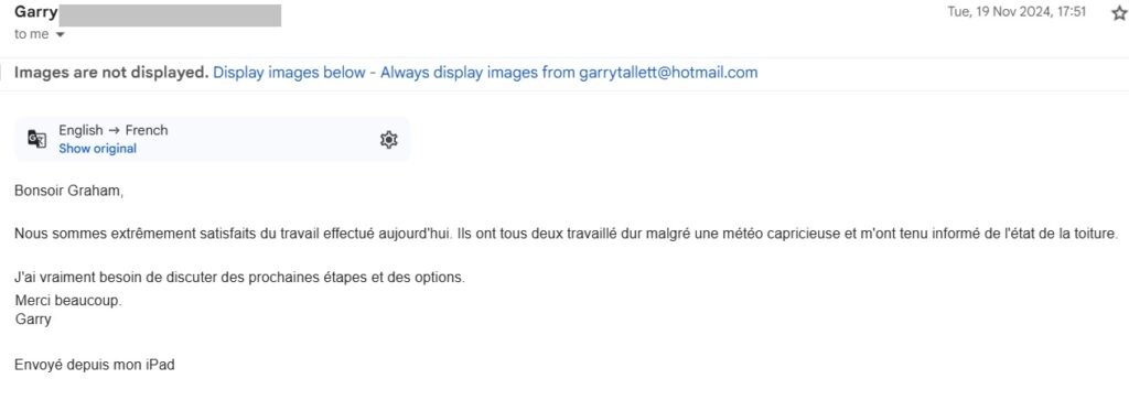 Ce service ne comprend pas le remplacement des faîtières, des solins, de la charpente ou des fenêtres Velux. Ces éléments seront abordés lors de l’inspection, et si vous le souhaitez, l’équipe demandera au bureau de vous fournir un devis.